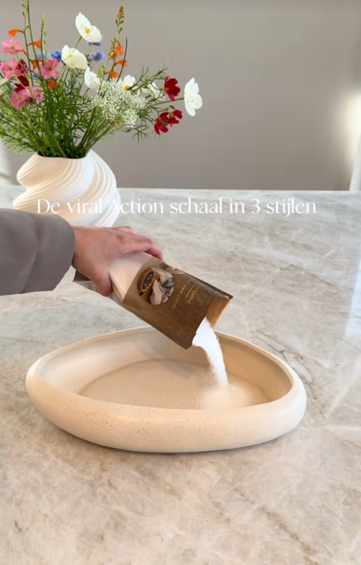 Wat deze schaal zo populair maakt, is hoe veelzijdig hij is. Online laten Action-fans zien hoe ze de schaal vullen met fruit, kaarsen of zelfs een salade – elke keer weer een totaal andere look. Het is dus niet zomaar een decoratiestuk, maar een multifunctioneel item dat je naar eigen smaak kunt inzetten.