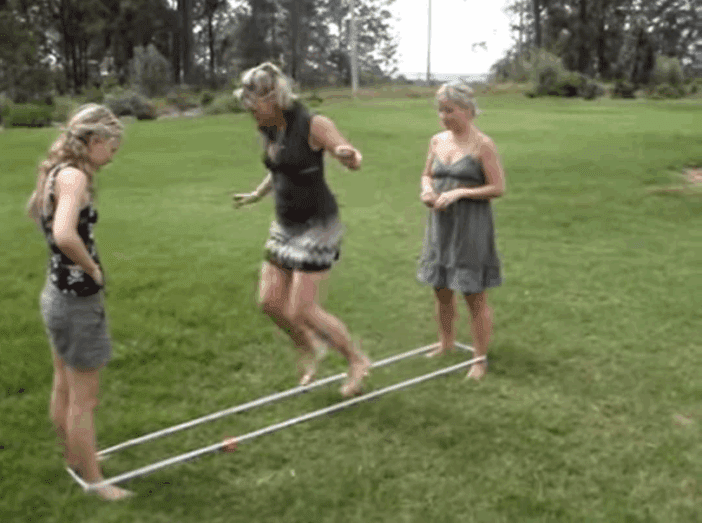 Je had alleen een lang stuk elastiek nodig, dat je om de benen van twee spelers spande, meestal rond de enkels. De derde speler moest allerlei sprongpatronen uitvoeren: in, op, eruit, twist, en ga zo maar door. Ging het goed? Dan werd het elastiek een niveau hoger gespannen – naar de knieën, heupen of zelfs oksels!