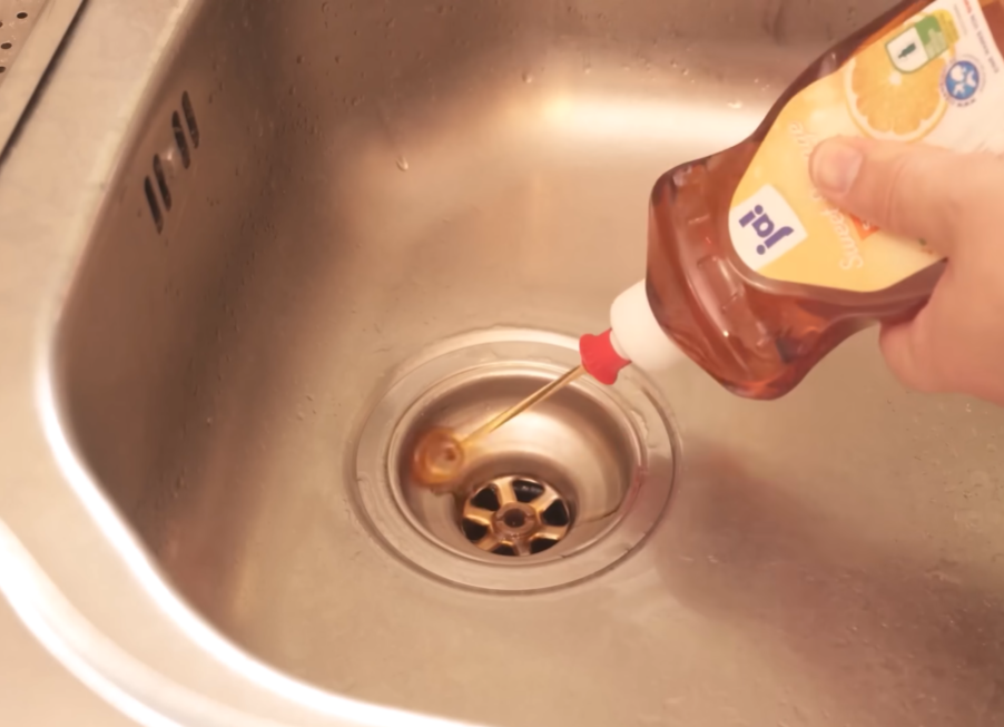 Giet een halve fles afwasmiddel rechtstreeks in de afvoer.