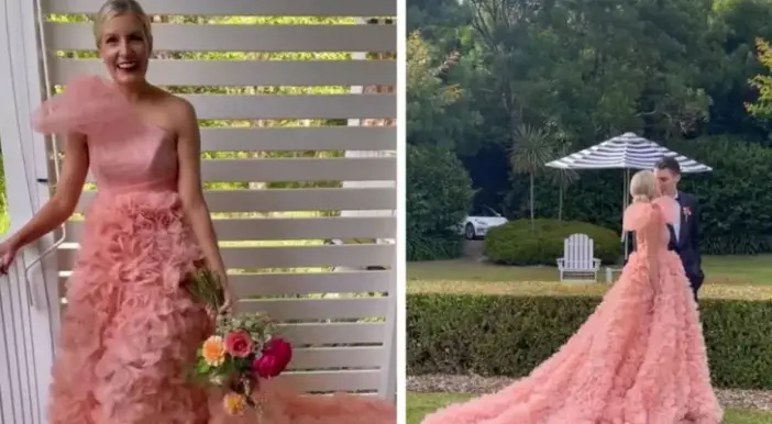 Roze trouwjurk maakt tongen los: “Waarom geen witte jurk?”