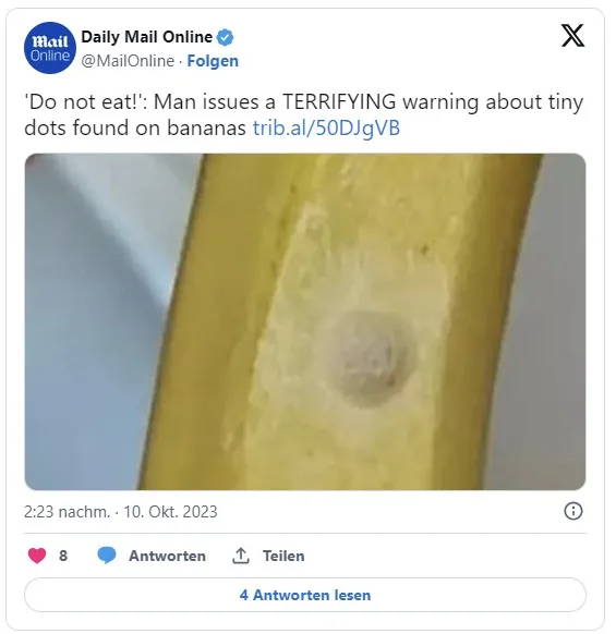 Een woordvoerder van de supermarktketen “Asda” reageerde ook: “De witte stip op de banaan lijkt op een nest van wolluizen. Hoewel deze volledig ongevaarlijk zijn, nestelen ze zich graag, net als andere insecten, tussen de bananen. Ze vinden daar een prettige, beschermde leefomgeving.”