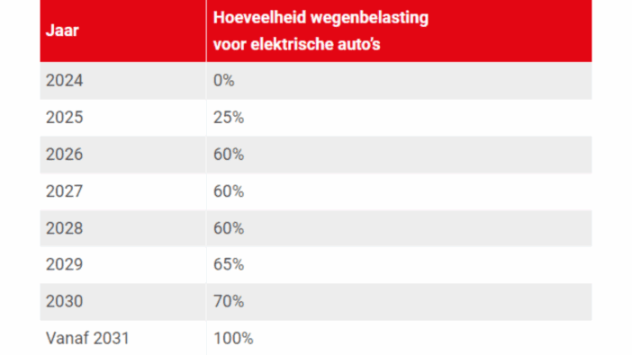 Op dit moment zijn elektrische auto’s nog vrijgesteld van motorrijtuigenbelasting, oftewel wegenbelasting. Maar dat verandert binnenkort. Vanaf 2025 zullen eigenaren van elektrische voertuigen ook wegenbelasting gaan betalen. Het eerste jaar krijgen ze nog een korting van 75 procent, maar deze wordt in de jaren daarna geleidelijk afgebouwd.