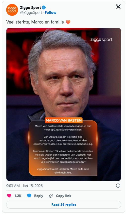 In een officiële mededeling heeft Ziggo Sport laten weten dat Van Basten voorlopig niet zal aanschuiven bij zijn vaste programma’s en ook geen wedstrijden meer zal analyseren. De reden is privé en ingrijpend: Liesbeth staat aan het begin van een intensief behandeltraject dat de komende maanden veel van haar en haar gezin zal vragen.