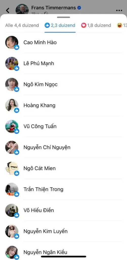 Wie door de lijst met accounts bladert die de berichten van Timmermans waarderen, ziet opvallende patronen. Het gaat vaak om profielen met namen die in Nederland weinig voorkomen, zonder persoonlijke inhoud of met standaardfoto’s en afbeeldingen van internet. Sommige accounts volgen in korte tijd tientallen politieke pagina’s, een bekend kenmerk van gekochte likes.