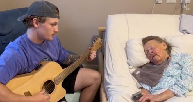 Terwijl ze op haar sterfbed lag, had ze één duidelijke wens. Ze wilde haar achterkleinzoon nog één keer horen zingen. Ethan, die zijn hele leven al gek is op muziek, twijfelde geen seconde. Met zijn gitaar liep hij de ziekenhuiskamer binnen, ging naast haar zitten en liet de eerste zachte akkoorden klinken. De intimiteit van dat moment – klein, teder, onvergetelijk – werd vastgelegd op video, zodat de familie en uiteindelijk ook de rest van de wereld het mee kon beleven.