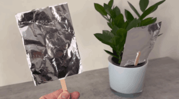 Hij steekt een stuk aluminiumfolie naast een plant, wat een geniaal ideetje!25 juni 2025 door ZelfmaakideetjesAl