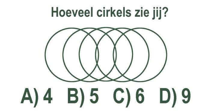 De visuele uitdaging die hier gepresenteerd wordt, is verre van eenvoudig. Het juiste antwoord is vijf cirkels. Had je dat goed? Zo ja, felicitaties! Breng nu wat plezier voor jouw vrienden en deel deze hersenkraker met hen om te zien of ze het ook kunnen oplossen.