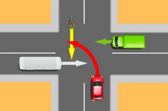 De rode auto, die naar links afslaat, zal meestal voorrang moeten verlenen aan tegemoetkomende voertuigen, waaronder de motorrijder, de groene vrachtwagen, en de witte bus. Het is gebruikelijk dat voertuigen die links afslaan voorrang verlenen aan alle tegemoetkomende voertuigen, teneinde de veilige doorstroming van het verkeer op de kruising te waarborgen.