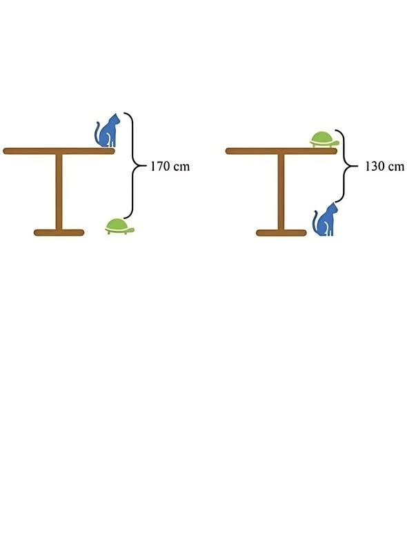 Schildpad op tafel, kat op de grond: het hoogteverschil is 130 cm.