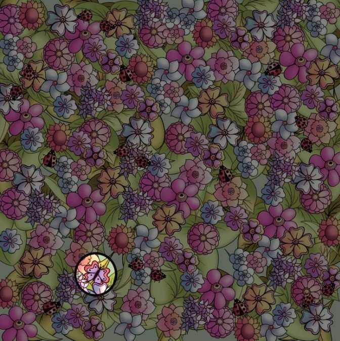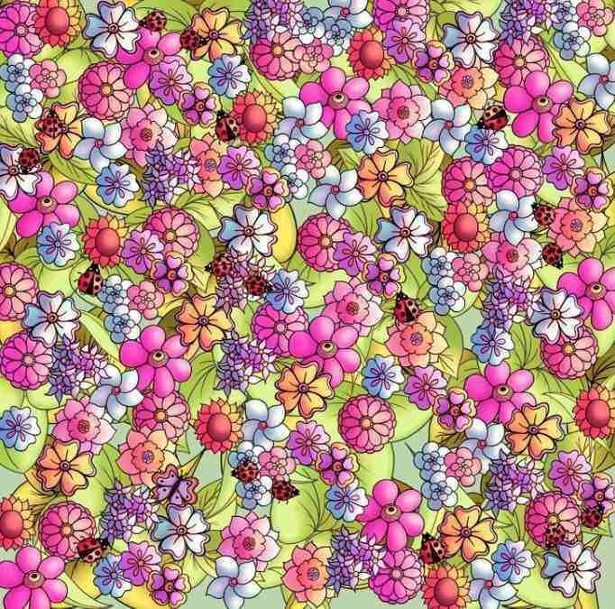 Voor je ligt een afbeelding met een prachtige bloemenpatroon vol levendige kleuren en ingewikkelde ontwerpen. Tussen de bloemen, lieveheersbeestjes en bladeren zit een vlinder verborgen. Kun jij hem binnen vijf seconden vinden?