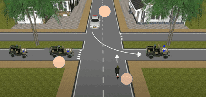 Stel je voor dat je een kruispunt nadert en je ziet een militaire colonne. Eén voertuig van de colonne is al doorgereden en de rest van de voertuigen staat nog te wachten voor de haaientanden. Op de voorrangsweg rijdt een motor rechtdoor en een auto wil linksaf slaan. De vraag is: wie mag er als eerste? Denk goed na over de voorrangssituatie en de verkeersregels die van toepassing zijn.