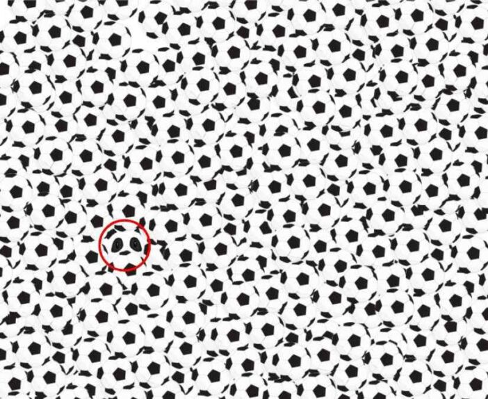 Deel deze beeldpuzzel met je vrienden en familie. Daag hen uit om de panda tussen de voetballen in deze afbeelding binnen 8 seconden of minder te vinden!