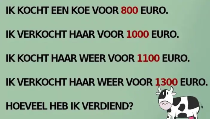 De rekensom die circuleerde ging als volgt: Stel, je schaft een koe aan voor 800 euro, verkoopt haar daarna voor 1000 euro, koopt haar opnieuw voor 1100 euro en verkoopt haar uiteindelijk voor 1300 euro. De vraag die je dan bezighoudt: wat is je winst aan het einde van de rit? Het lijkt simpel, maar het juiste antwoord versloeg veel sociaalmedia gebruikers, die alles tussen 100 en 300 euro gokten. En toch, het verrassende juiste antwoord is 400 euro. Kijk verder voor de uitleg.