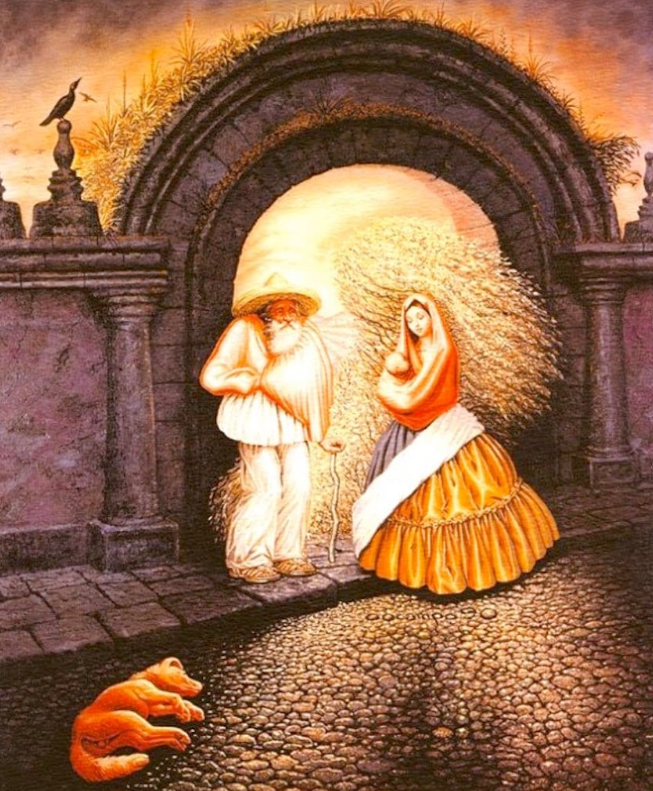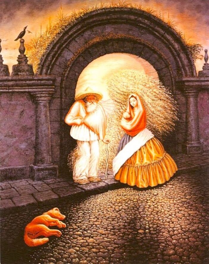 En dan is er nog een speelse bonus. Sommige mensen tellen ook de hond die ergens in de compositie rondsnuffelt. Doe je dat, dan kom je royaal uit op tien “gezichten” — al is dat natuurlijk een beetje valsspelen. Toch is het leuk om te merken hoe Ocampo met vormen speelt, zodat je telkens denkt: hé, dat is óók een snuit, of is het gewoon steen en schaduw?