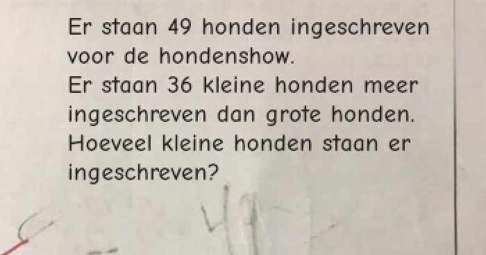 Hier gaat de wiskunde: als grote honden als ‘x’ worden aangeduid en kleine honden als ‘y’, dan is 49 = x+y en y = x+36. Vanuit deze vergelijking, hebben we vervolgens: 49 = 2x + 36, wat leidt naar 2x = 13 en dus x = 6,5 en y = 42,5.
