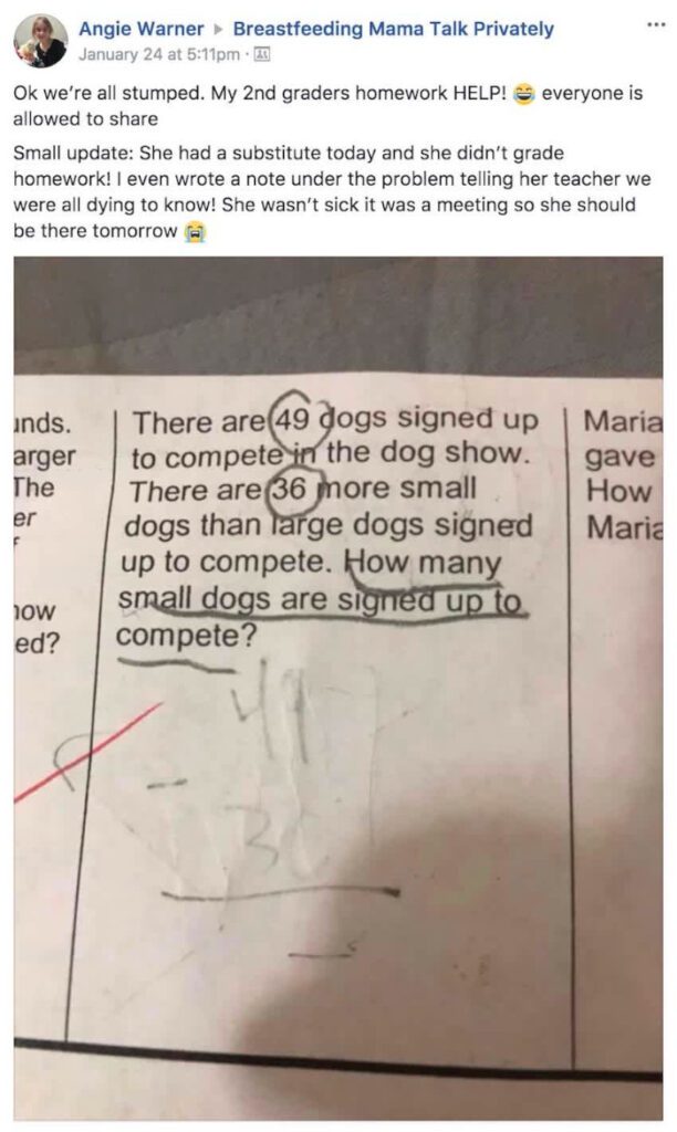 Angie Warner, een moeder van een meisje in groep vier, kwam een rekenprobleem tegen dat zowel zij als haar dochter niet konden oplossen. Bezorgd om deze moeilijke opgave, stelde ze hem open voor discussie op een Facebook-community genaamd ‘Breastfeeding Mama Talk Privately’. Het rekenprobleem verbaasde iedereen die op haar post reageerde.