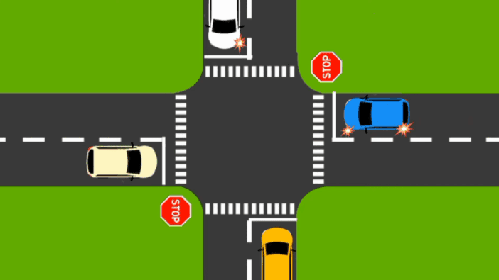 - Als laatste mag de blauwe auto de kruising oversteken. Deze auto slaat linksaf en had als extra nadeel dat hij voor een stopbord stond.