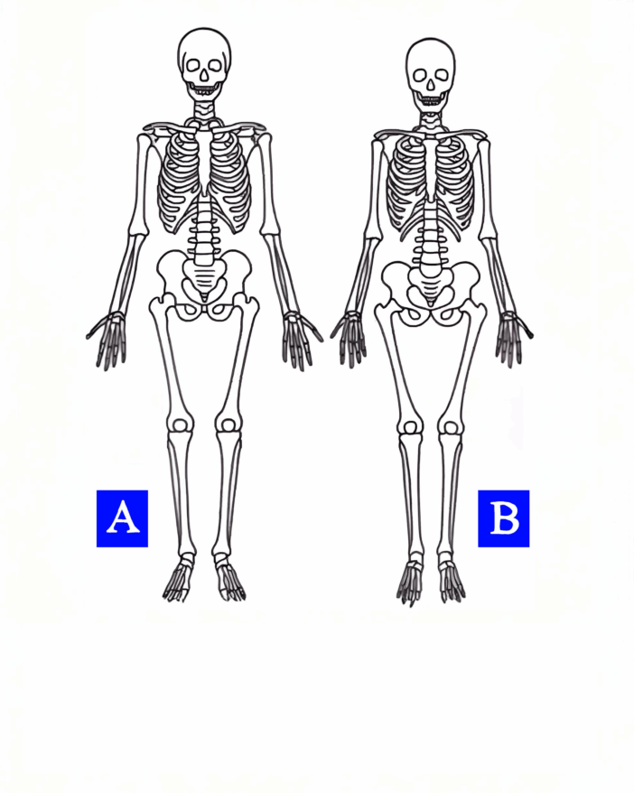 Op een illustratie met twee skeletten, aangeduid met A en B, lijkt de uitdaging simpel. Beide figuren hebben dezelfde houding, dezelfde botstructuur en op het eerste gezicht geen opvallende verschillen. Toch is er één deel van het skelet dat vrijwel altijd de doorslag geeft. De vraag blijft dus staan: welke van de twee is een vrouw?