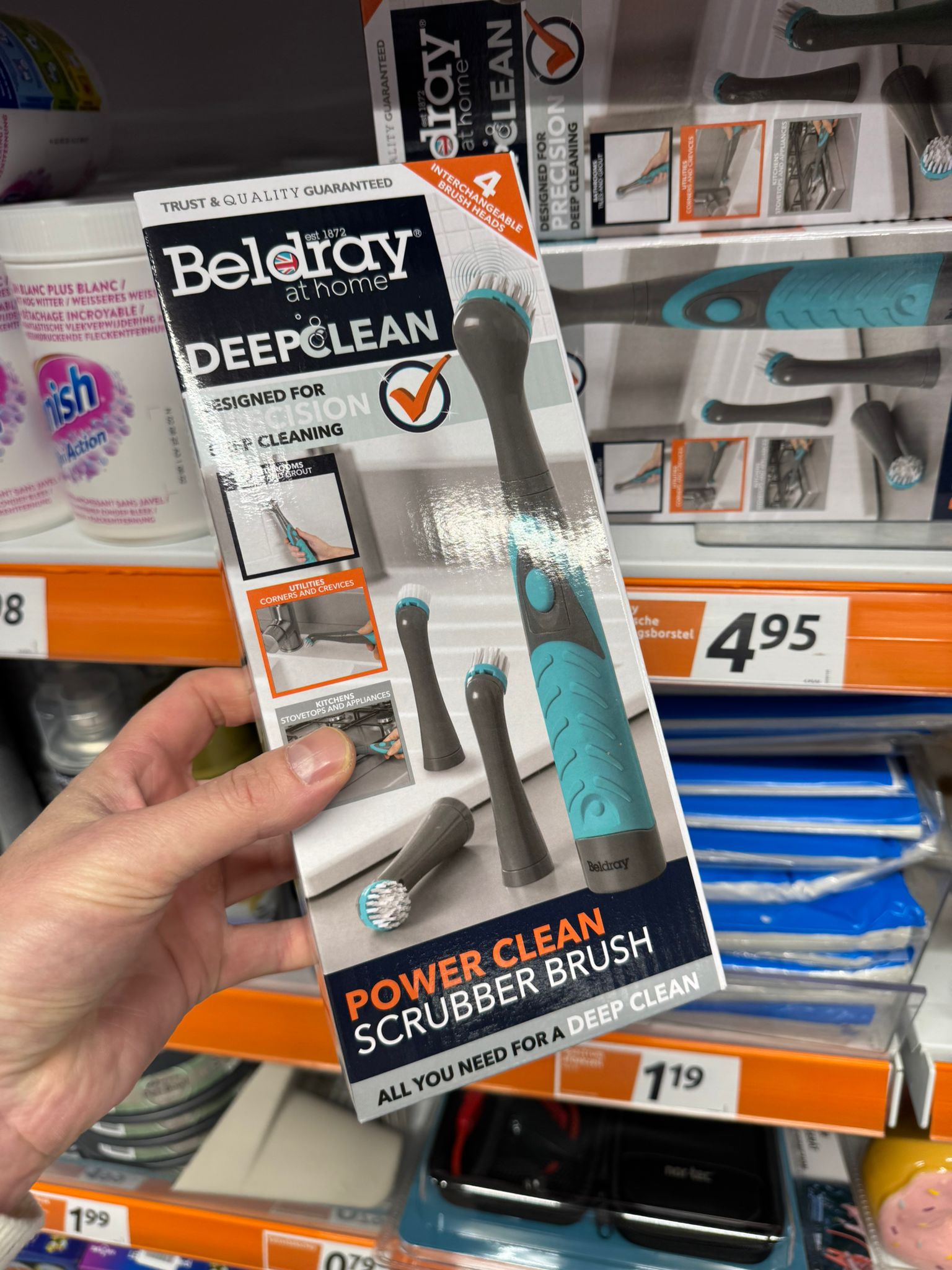 Met een prijs van nog geen vijf euro is dit een van de goedkoopste elektrische schoonmaaktools op de markt. Toch voelt de borstel stevig aan en levert hij verrassend veel vermogen. Je hebt geen dure schoonmaakapparaten of agressieve middelen meer nodig – een beetje allesreiniger of azijn is vaak al genoeg.