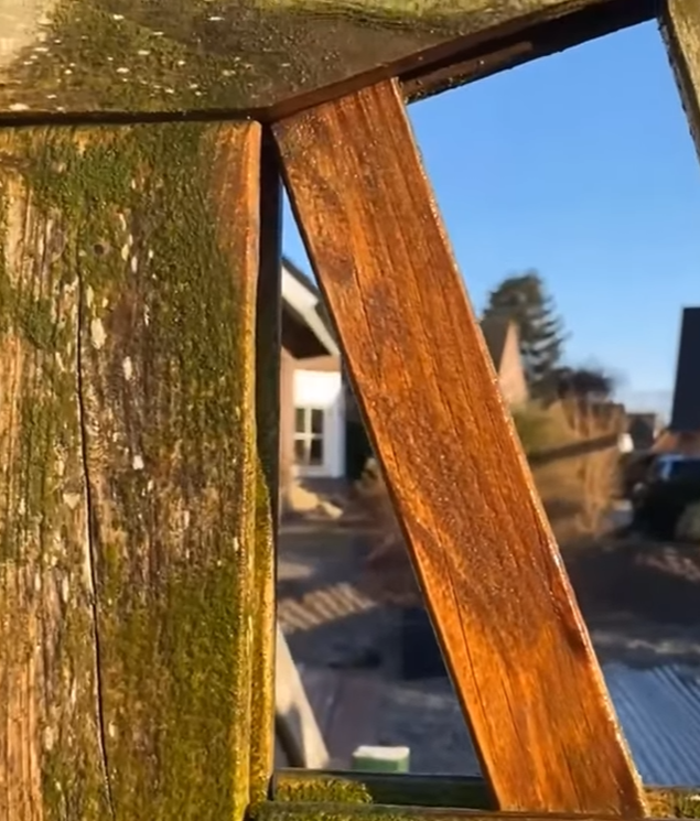 5. Afspoelen: Spoel het geheel grondig af met de tuinslang of met emmers schoon water. Je ziet de groene sluier letterlijk van het hout verdwijnen. Blijft er nog wat achter? Herhaal de behandeling plaatselijk.