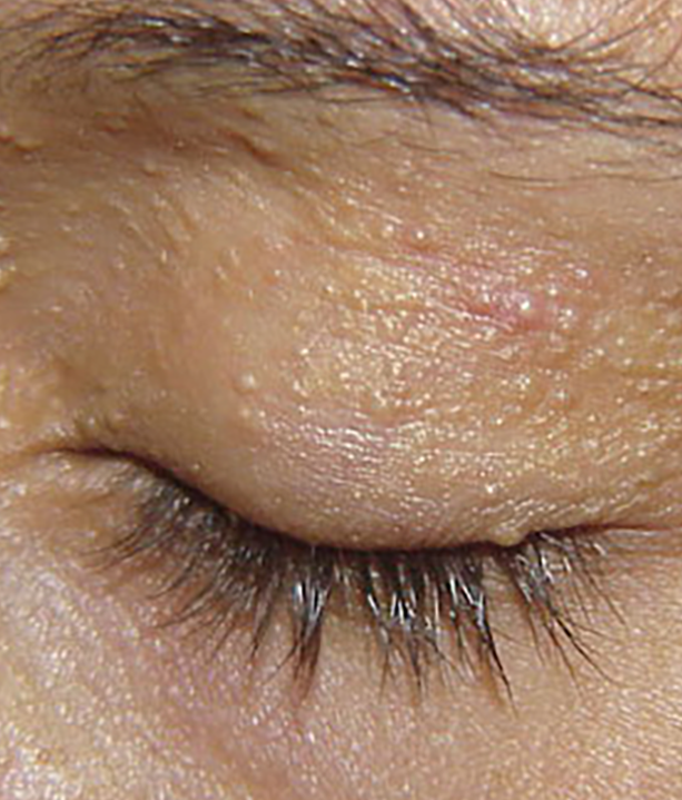 Gebruik geen zware, olie-rijke of afsluitende crèmes, vooral niet rond de ogen. Reinig de huid dagelijks, exfolieer wekelijks met een milde AHA- of BHA-exfoliant en bescherm de huid tegen de zon met een SPF. Kies bij voorkeur niet-comedogene huidverzorging.