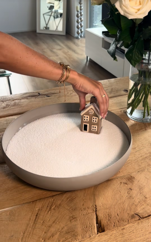 Tijdens haar bezoek aan de Action kocht ze een stijlvolle design schaal, een zak kaarsenzand en een paar kleine kersthuisjes en decoratiestukjes. Thuis begon ze aan haar creatieve project. Ze vulde de schaal met een laag kaarsenzand, zodat de ondergrond mooi egaal was. Vervolgens plaatste ze de kleine huisjes, boompjes en miniatuurfiguren erin, alsof ze een klein winters dorpje aan het bouwen was.