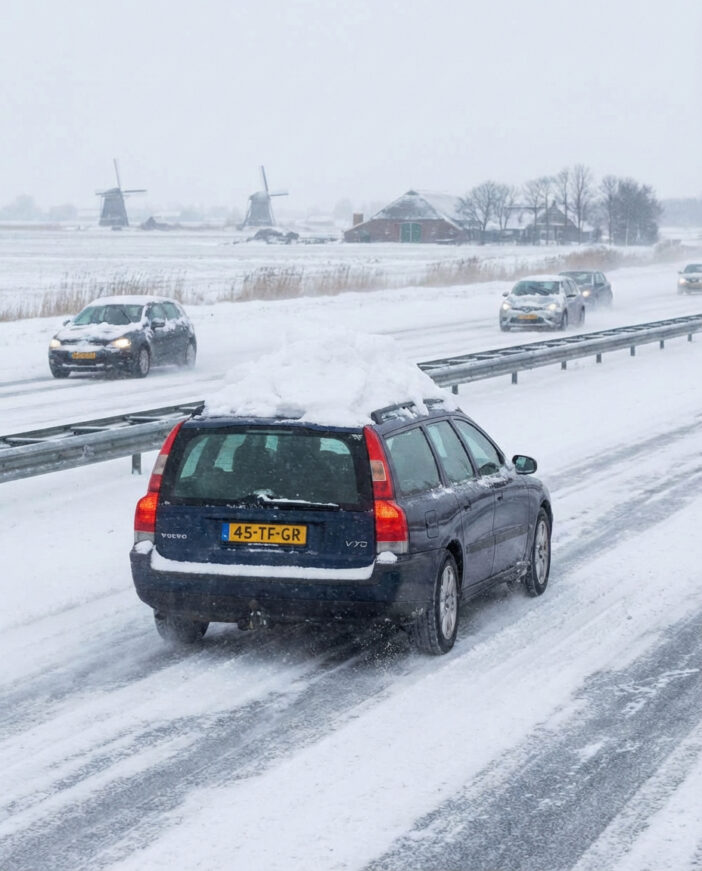 Sneeuw op het dak lijkt onschuldig, maar vormt in de praktijk een groot risico. Bij plotseling remmen kan de sneeuw in één keer naar voren schuiven en je eigen voorruit volledig blokkeren. Ook kan sneeuw loskomen en op de voorruit van een achterligger belanden. Dat kan leiden tot schrikreacties, noodstops en ongelukken.