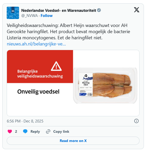 Albert Heijn roept klanten met klem op om een bepaalde haringfilet thuis niet meer te eten. In het product is mogelijk de bacterie Listeria monocytogenes aangetroffen, een ziekteverwekker die in ernstige gevallen levensgevaarlijk kan zijn. Zowel de supermarktketen als de Nederlandse Voedsel- en Warenautoriteit (NVWA) benadrukken: niet consumeren.